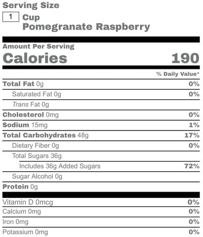 Water, Sugar, Corn Syrup, Pomegranate Raspberry Base (Water, Sugar, Plum Juice Concentrate, Natural Flavor, Citric Acid, Pomegranate Juice Concentrate, Raspberries, Fruit and Vegetable Juice (For Color), Apple Juice Concentrate, Pineapple Juice Concentrate), Contains Less Than 1% Of Fruit Juice and Vegetable Juice (For Color), Pectin.