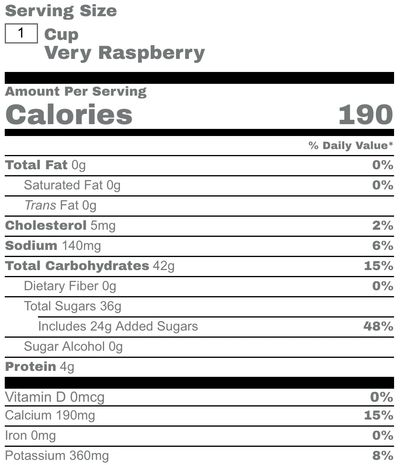 Pasteurized Non Fat Milk, Liquid Sugar (Sugar, Water), Pasteurized Sweet Cream Buttermilk, Pasteurized and Cultured Non Fat Milk, Corn Syrup, Whey, Raspberry Base (Water, Sugar, Natural Flavor, Citric Acid, Raspberries, Modified Food Starch, Elderberry Juice Concentrate, Red #3, Red #40, Blue #1), Contains Less Than 1% Of Non Fat Dry Milk, Mono- & Diglycerides, Cellulose Gum, Guar Gum, Modified Food Starch, Carrageenan, Pectin. Contains the following live and active cultures: S. thermophilus, L. bulgaricus, L. lactis, L. acidophilus and Bifidobacterium.